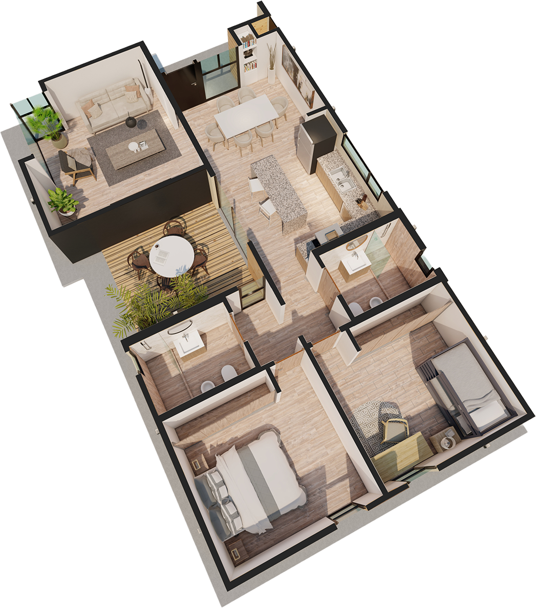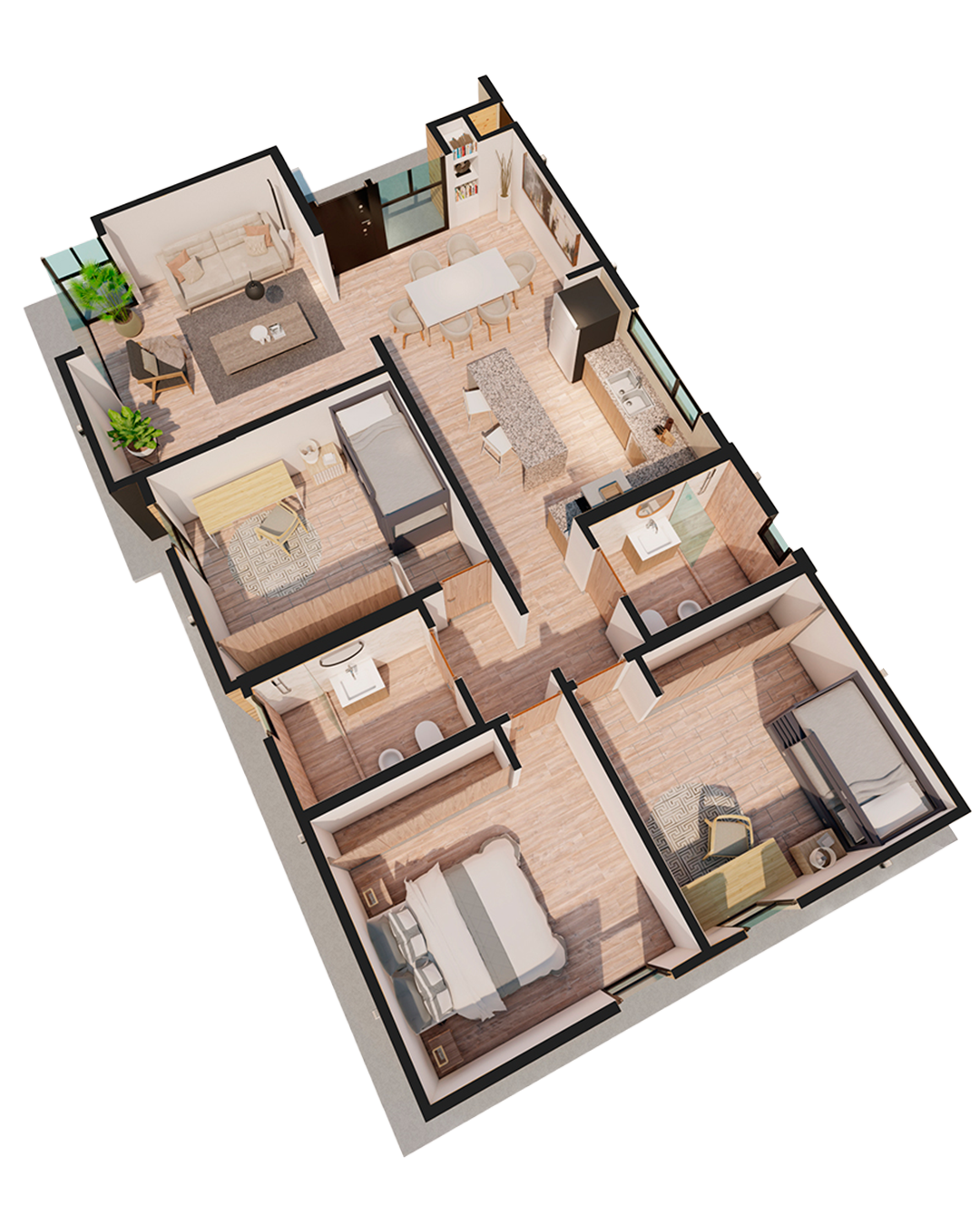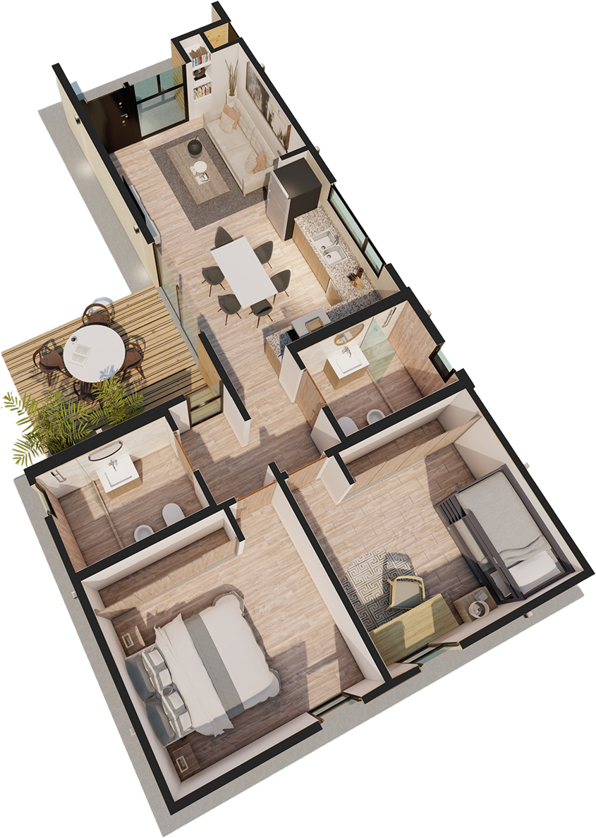 70 m² | 3 ambientes | Cocina-comedor-living integrados | 2 dormitorios | 2 baños